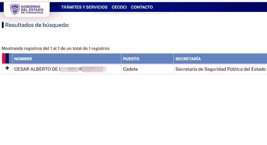En el directorio de Gobierno del Estado, su nombre aparece con el puesto de cadete en la SSPE.