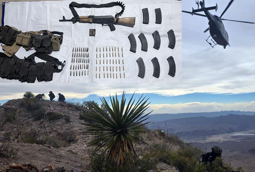 Noticias de Chihuahua. – En un cerro cercano a Chorreras, municipio de Aldama, integrantes de las fuerzas federales y policías encontraron abandonado un fusil de asalto, cargadores y equipo táctico.