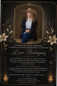 Noticias de Chihuahua. – Lina Alejandra Rodríguez Castillo, empresaria y secretaria nacional de la creciente organización Mujeres Ganaderas de México (MUGAM), fue asesinada esta tarde al ser atacad con arma punzo cortante junto con otra mujer que resultó gravemente herida, según trascendió en las redes sociales.
