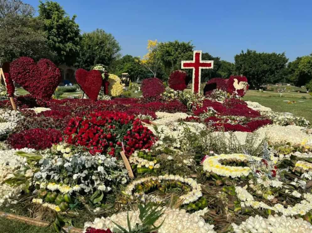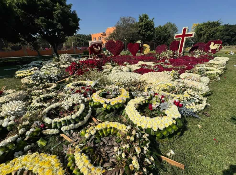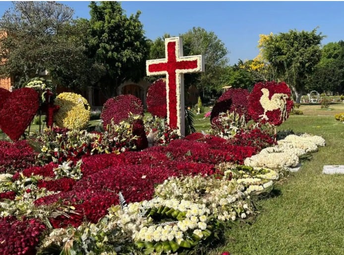 Las fotografías muestran una cruz central rodeada de enormes ramos y coronas colocadas por personas que permanecen en el anonimato. Incluso, en algunas imágenes se aprecia que el sepulcro sobresale entre las demás tumbas debido a la gran cantidad de arreglos que lo rodean.