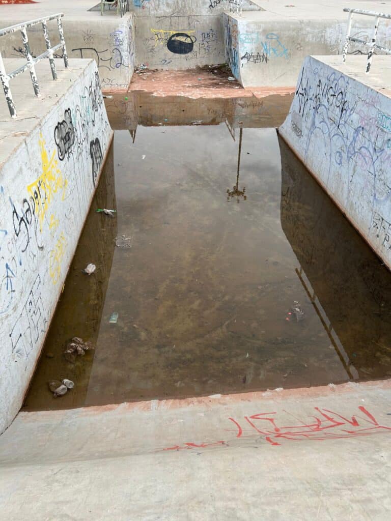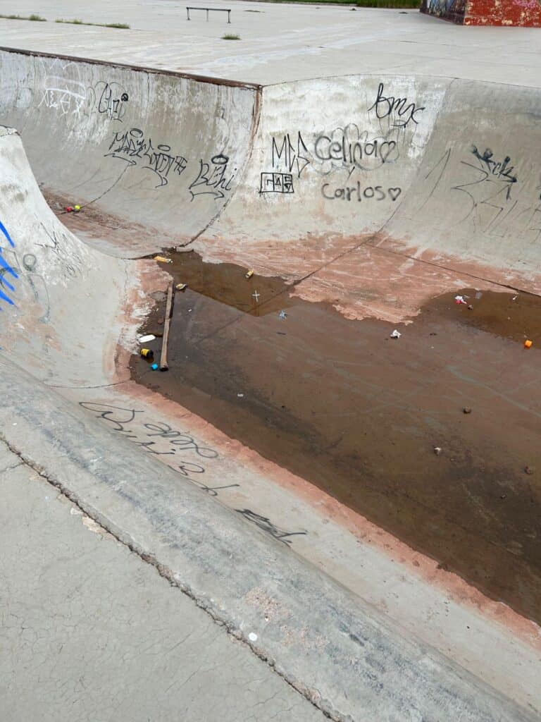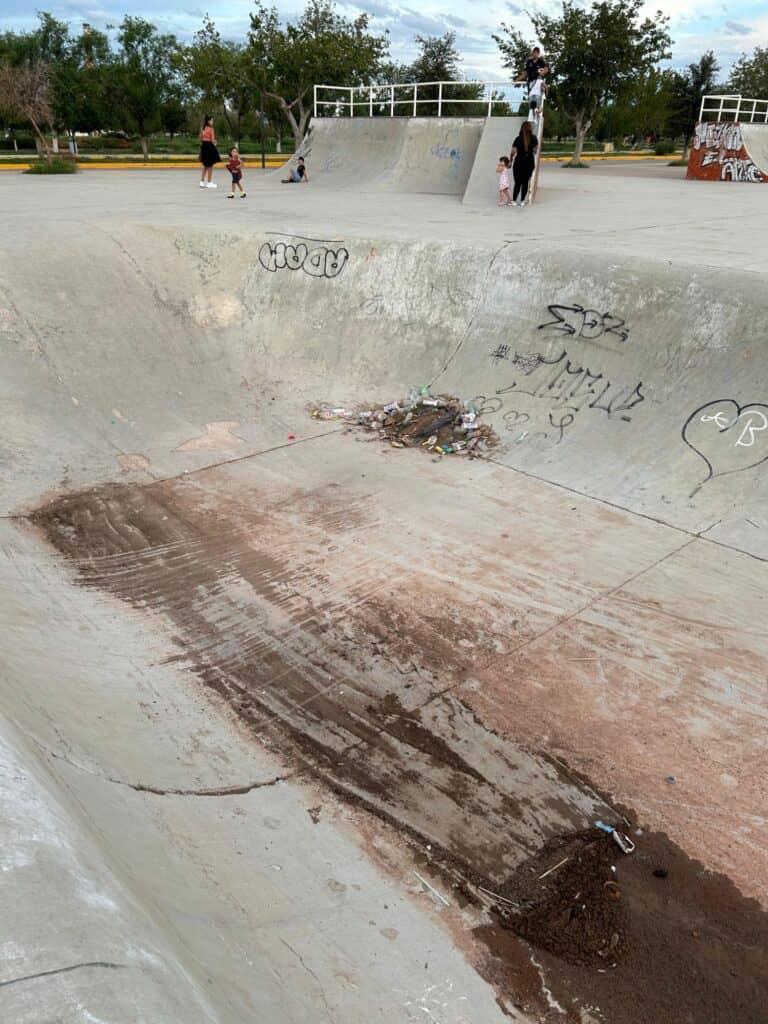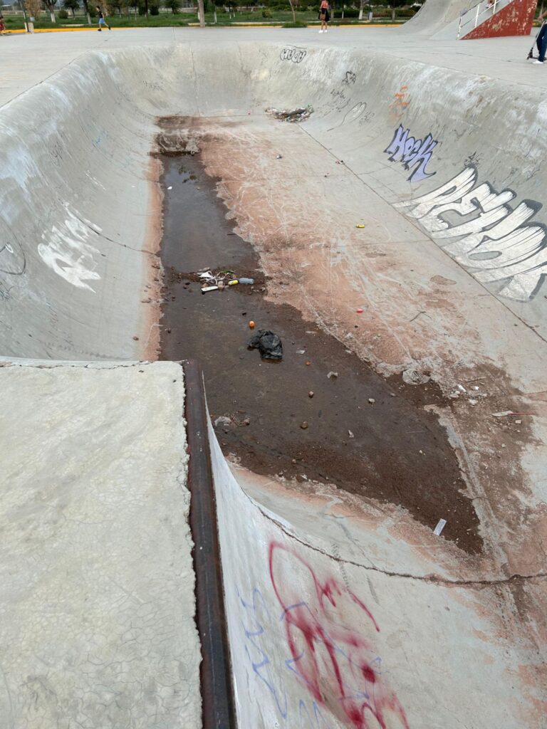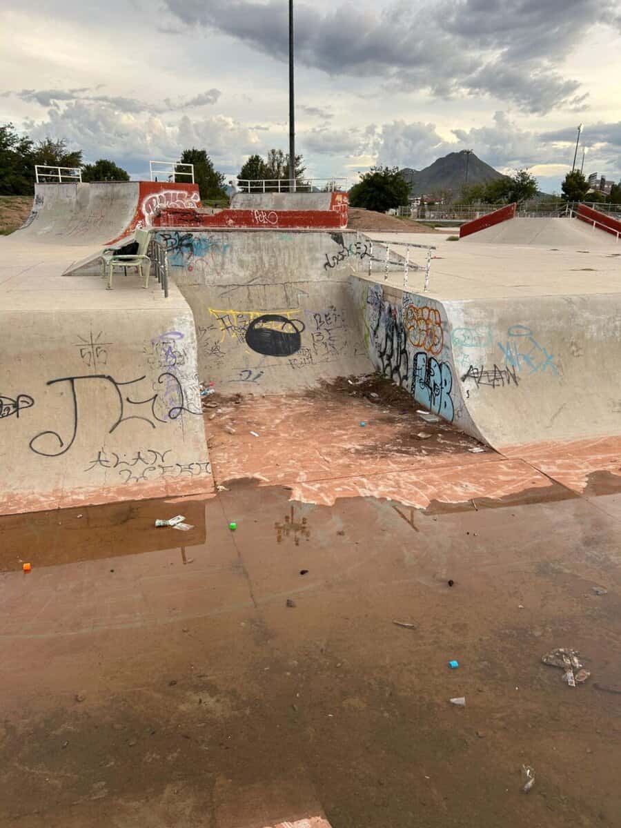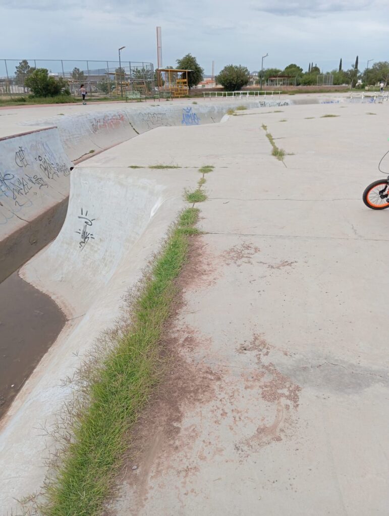Noticias de Chihuahua.- Las rampas de la deportiva sur están en estado deplorable y los usuarios ya no aguantan más el abandono. Patinadores de BMX, skate, scooter y roller denuncian que el área luce como terreno baldío: basura acumulada, agua estancada con animales, césped creciendo en lugares insólitos, rampas llenas de grafitis y, para colmo, sin luz por un transformador que lleva años descompuesto.