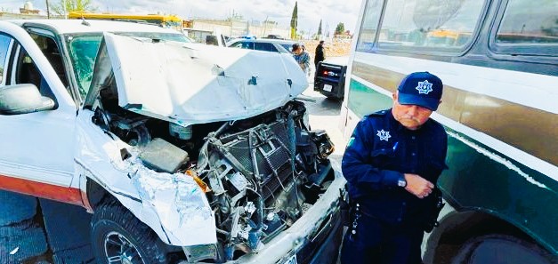 Chihuahua, Chih.- Un aparatoso accidente ocurrió en el cruce de la Vialidad Chepe y la calle Justiniani, involucrando a una pick-up Chevrolet de modelo atrasado y un camión urbano de la ruta Plan de Ayala, con número económico 713.