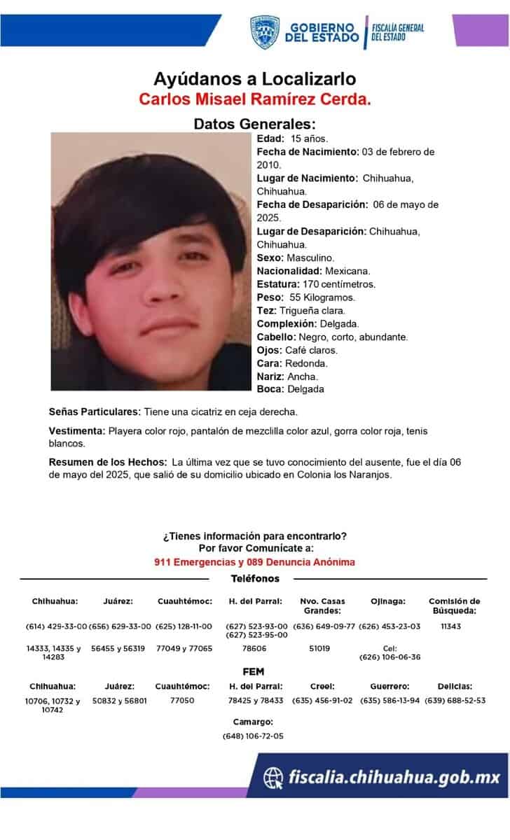 Noticias de Chihuahua. – Las autoridades piden el apoyo de la ciudadanía para localizar a un adolescente que desapareció ayer, en la colonia Los Naranjos.