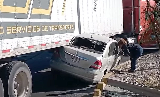 Noticias de Chihuahua. – Atrapada dentro de su auto, asustada y lesionada quedó una conductora esta mañana, cuando su vehículo fue aplastado por la caja de un tráiler en el trébol de las avenidas Homero y Tecnológico.