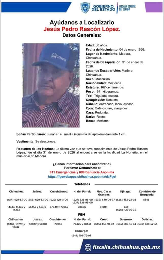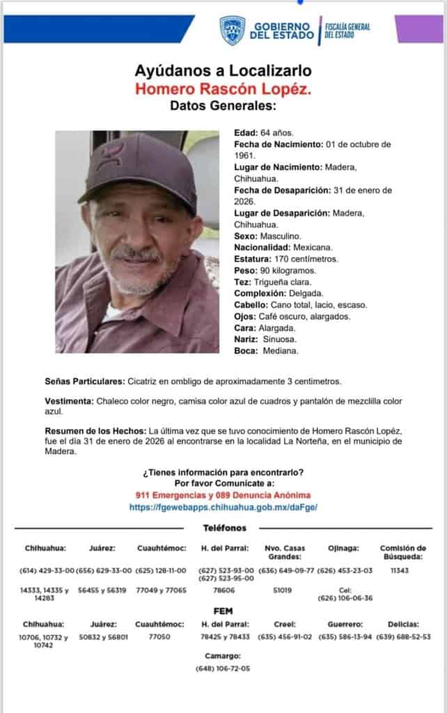 Las personas ausentes son; Jesús Pedro Rascón López, de 60 años de edad; Olivia Urquijo Gutiérrez, de 49 años; Cecilia Moreno Girón, de 62 y Homero Rascón López, de 64 años.