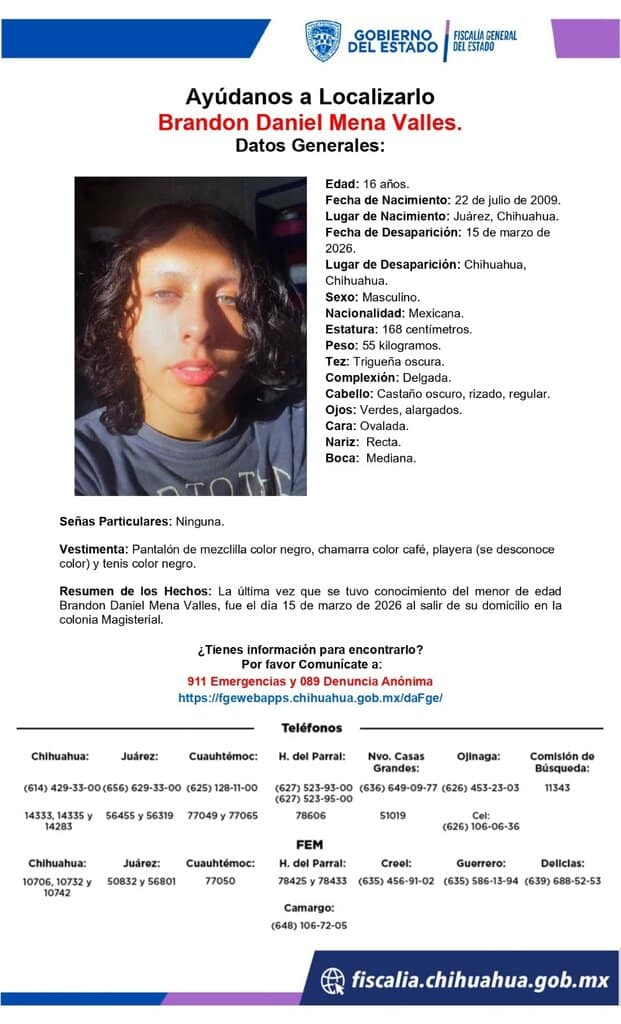 Noticias de Chihuahua. – La fiscalía estatal solicita el apoyo de la ciudadanía para localizar al joven Brandon Daniel Mena Valles, quien desapareció en la colonia Magisterial.