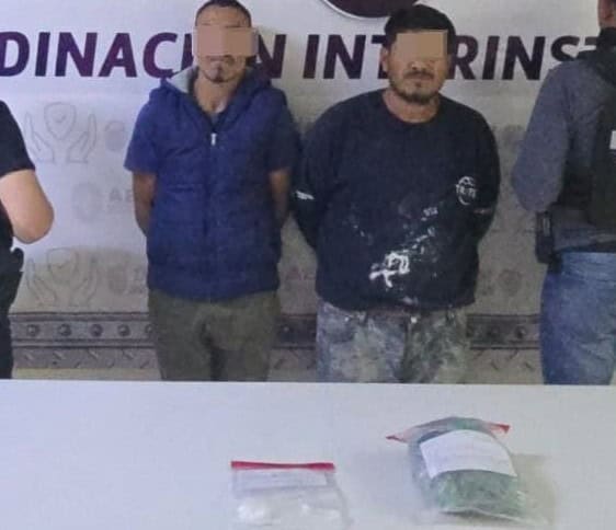Ellos fueron detenidos en flagrancia por delitos contra la salud en su modalidad de narcomenudeo, ya que durante la intervención se aseguraron diversas sustancias con características similares a droga sintética conocida como cristal, así como hierba verde seca con características de marihuana.