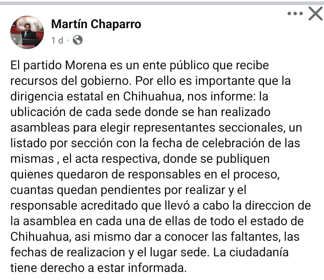 MARTÍN Chaparro, ex dirigente estatal de Morena, a través de un mensaje, volvió a encender la red. Y es que solo recordó para que nació Morena: Bajo la promesa de regenerar la vida pública del país, como un contrapeso a la vieja política de intereses, cuotas y cuates. Pero en Chihuahua —como en muchas otras regiones— esa esperanza ya huele a rancio.