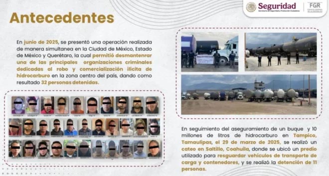 Por su parte, el titular de la Secretaría de Seguridad y Protección Ciudadana, Omar García Harfuch, detalló que tras siete meses de labores de inteligencia también se logró la captura de 14 personas en la zona centro del país, vinculadas a la obtención y venta ilegal de hidrocarburos, a quienes se les decomisaron equipos, vehículos y recursos.