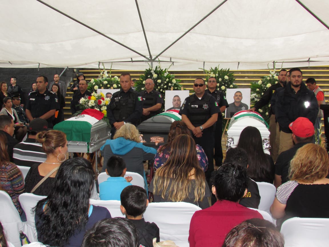 De los 4 agentes asesinados, solo tres cuerpos fueron presentados ante las familia, esposas, hijos, hermanos y compañeros de los elementos abatidos rindieron guardia de honor entre lagrimas y llantos.