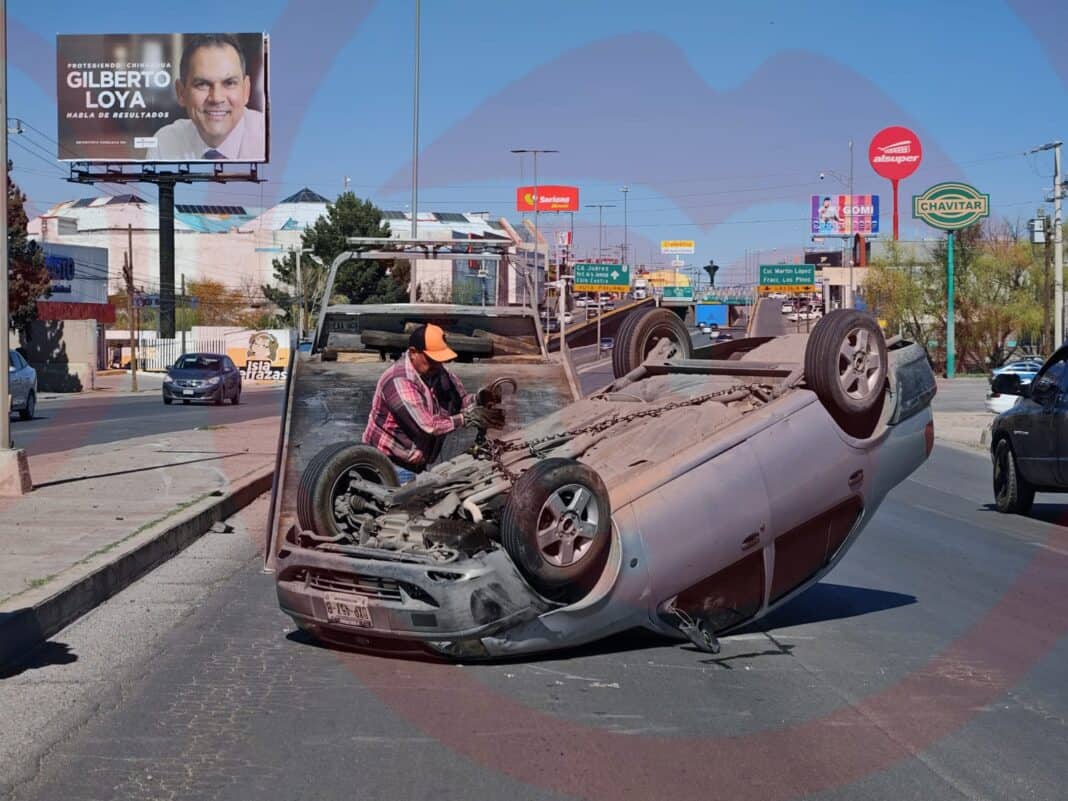 Noticias de Chihuahua.- Un aparatoso choque con volcadura desató el caos vial esta tarde sobre la transitada avenida Silvestre Terrazas, donde una pick-up proyectó a un vehículo compacto hasta dejarlo con las llantas apuntando al cielo en los carriles contrarios.