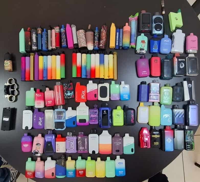 Entre los objetos entregados se encontraban 109 vapeadores de distintas marcas, un dispositivo con extracto de cannabis, un bóxer metálico color cromado, un aparato tipo taser color negro con la leyenda “801TYPE”, así como un frasco con esencia utilizada para rellenar cigarrillos electrónicos.