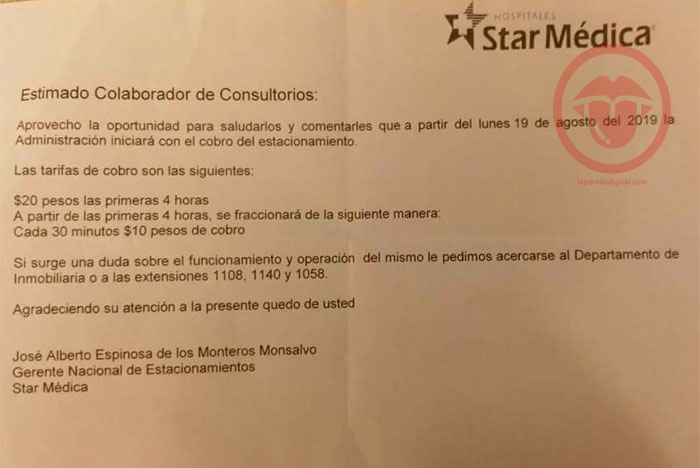Chihuahua.- El Hospital Star Médica Chihuahua decidió empezar a cobrar en si estacionamiento a sus pacientes y personal, por lo que lo calificaron de “injusto”.