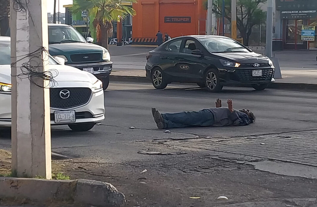 Noticias de Chihuahua. – Un hombre al parecer enfermo de sus facultades mentales se acostó en plena avenida Tecnológico, a la altura de la calle Tomochi, en la colonia Villa, causando caos vial y conatos de choques.