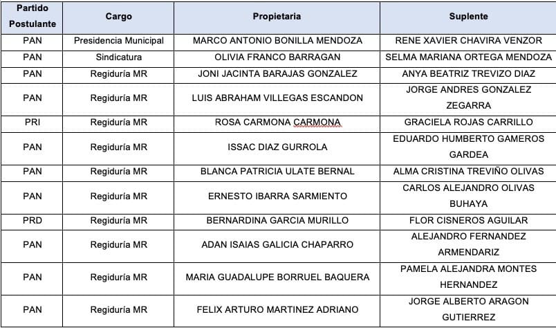 Entre los suplentes se encuentran el ex delegado de Economía y ex empleado municipal René Xavier Chavira, supliendo a Marco Bonilla; también la ex directora del Instituto de la Juventud Selma Mariana Ortega; la actual regidora Graciela Rojas; el cantante Eduardo “Lalo” Gameros; la empleada del Municipio Anya Trevizo Diaz: y la vicepresidenta, del Comité de Prevención y Atención a la Violencia Familiar y de Género Alma Cristina Treviño Olivas.