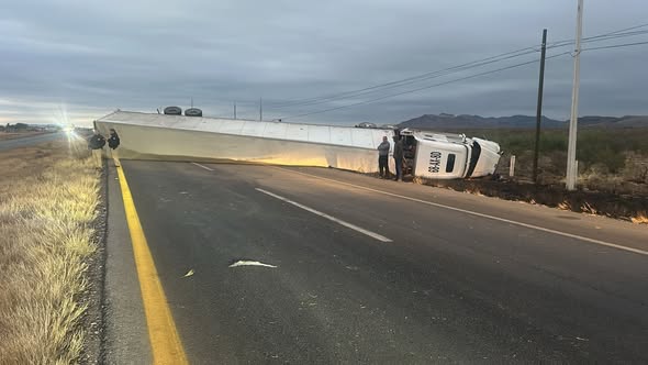 Noticias de Chihuahua. – Un tráiler quedó acostado en la carretera Delicias a Chihuahua esta mañana, obstruyendo el paso a los vehículos.
