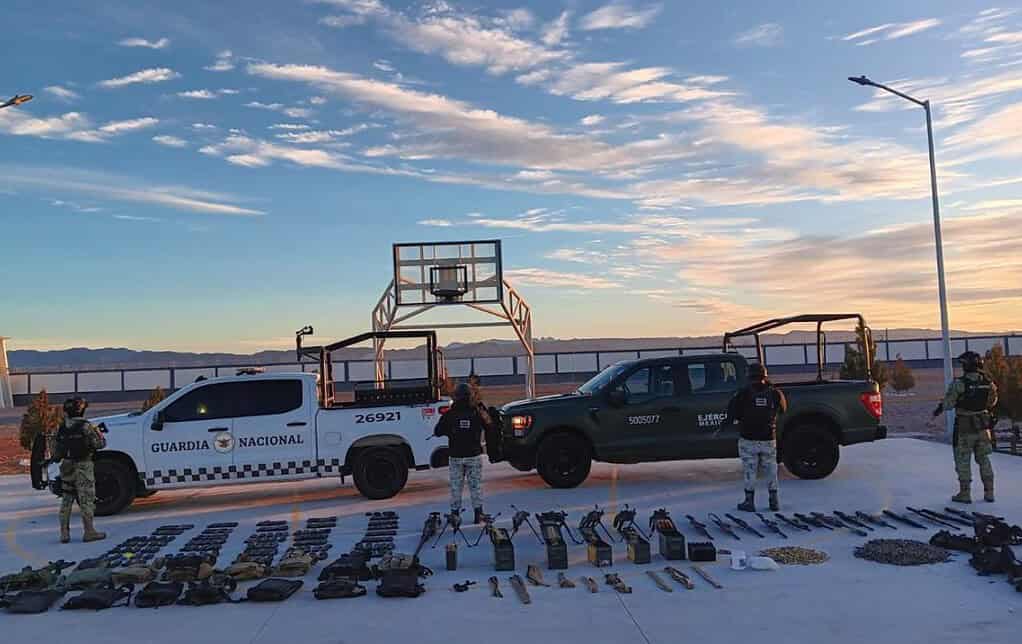 Noticias de Chihuahua. – Un arsenal y varios vehículos fue asegurado por personal de la Guardia Nacional y Defensa luego de que se dieron un topón a plomazos con unos malandros, en las brechas del municipio de Coyame.