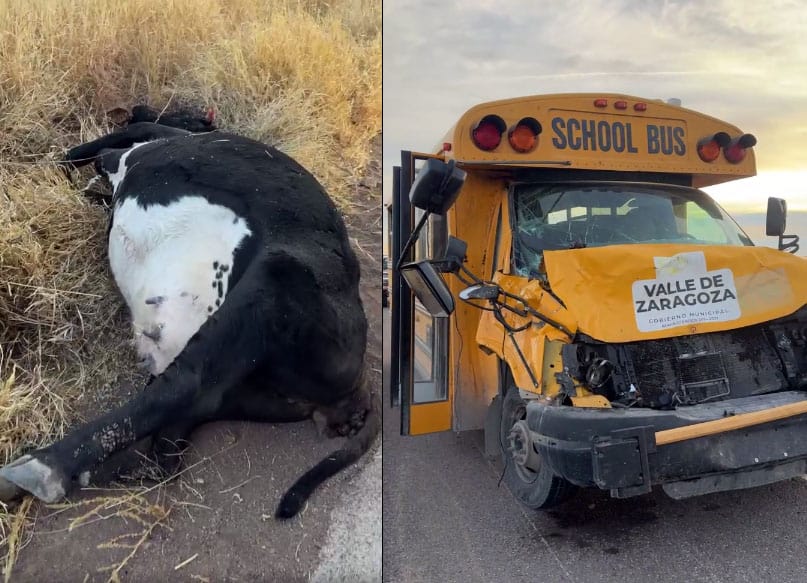 Noticias de Chihuahua. – Un camión de transporte escolar impactó y mato a una vaca esta mañana en la carretera vía corta a Parral.