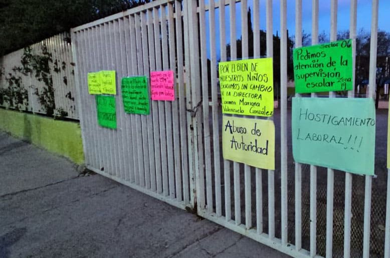 En el barandal perimetral de la escuela los inconformes pegaron cartulinas con mensajes.