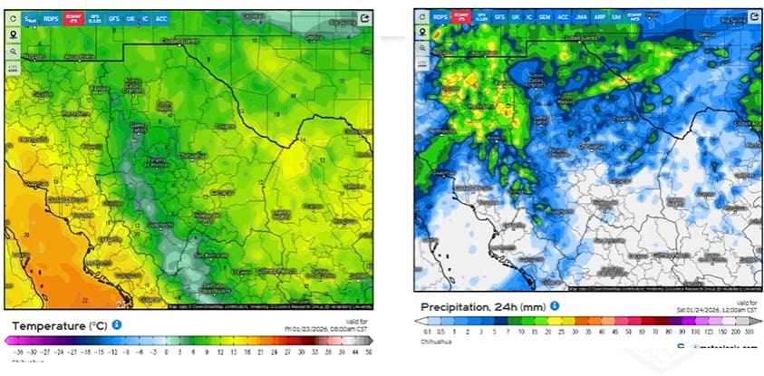 De acuerdo con CEPC, a partir de la tarde de este viernes y durante el fin de semana, se prevé la llegada de la tercera tormenta invernal de la temporada, con bajas temperaturas, lluvias, y posible nieve o aguanieve, principalmente en la zona serrana y la región fronteriza.